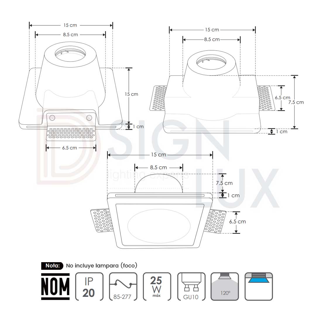 Lámpara de empotrar en techo, tipo trimless de yeso acabado blanco, base GU10 (foco no incluido), 25W máx., 85-277 V ca, óptica 120°, protección IP20. Breur Yeso – ILUEURTRIM6551W – Ilumileds