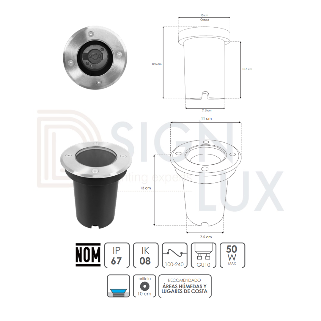 Luminario de piso base GU10, 50 Watts, redondo, de empotrar, tapa de acero inoxidable cuerpo aluminio incluye housing, 100-240V ca, protección IP67. ILUMXD1001GU10 – ILUMILEDS