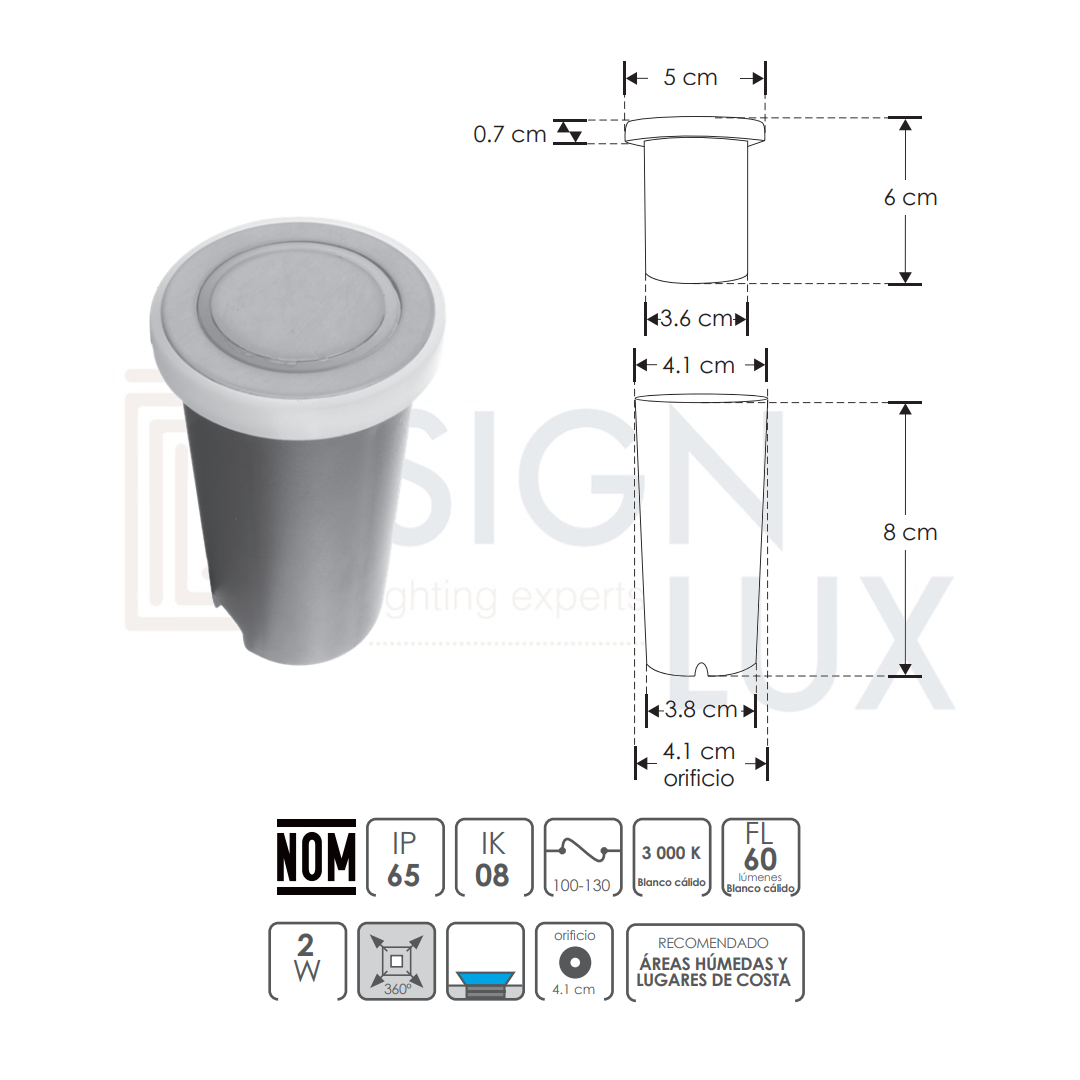 Luminario de piso, led, de exterior, 2W, redondo, de empotrar, policarbonato, acero inoxidable, cuerpo de aluminio incluye housing, 100-130V ca, protección IP65. ILUPISO2836 – ILUMILEDS