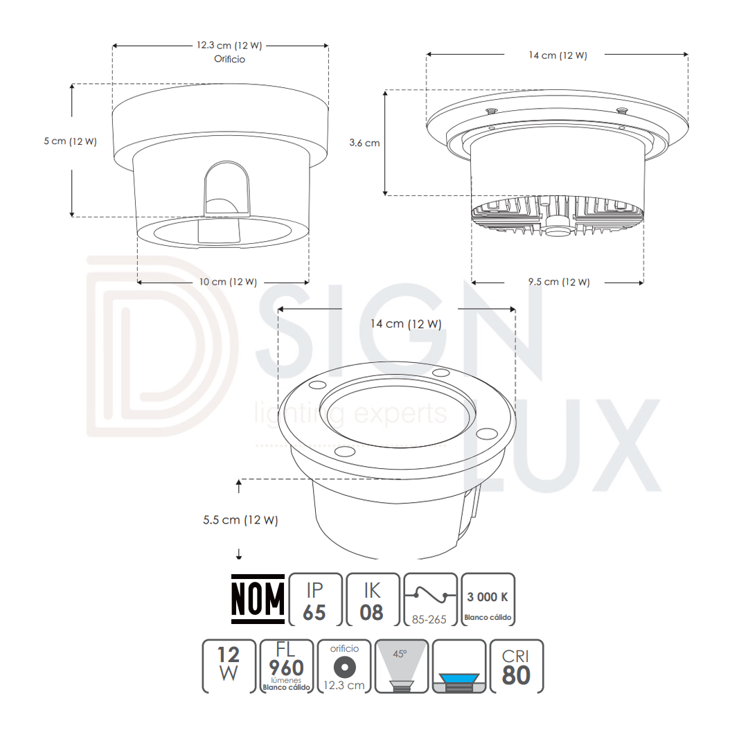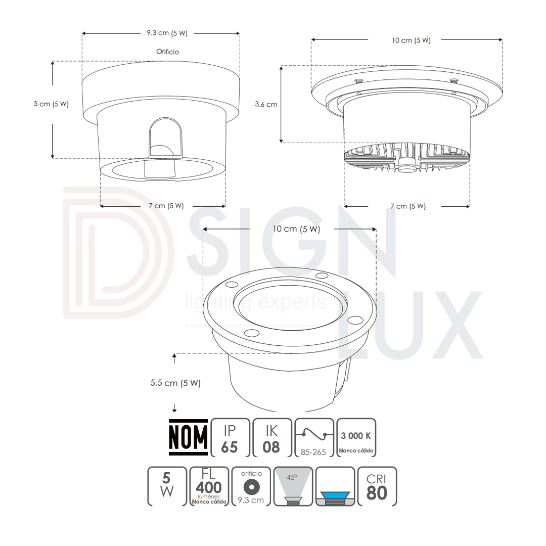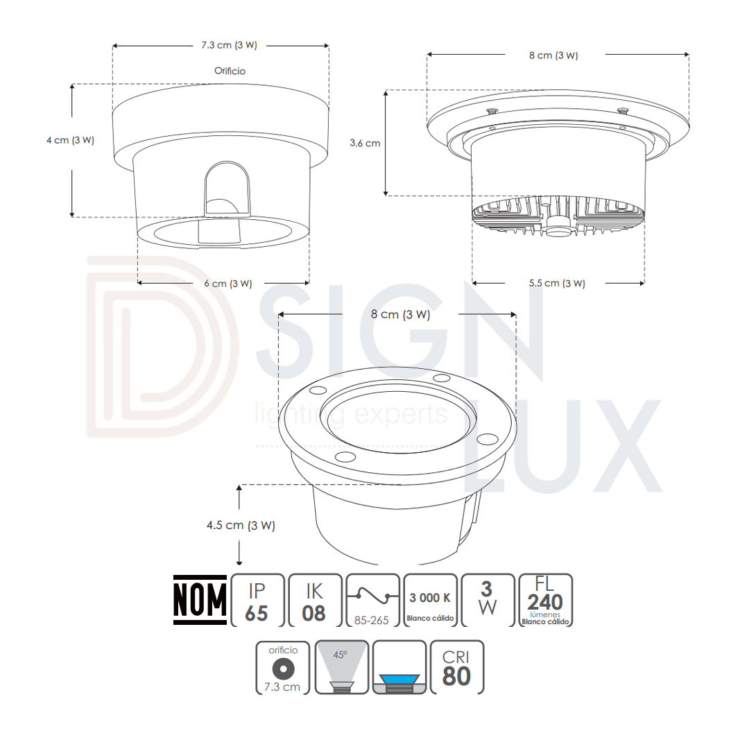 Luminario de piso, de led, blanco cálido, 3, 5 y 10 Watts, óptica 45°, redondo, de empotrar, tapa de acero inoxidable cuerpo aluminio incluye housing, 85-265V ca, protección IP65. ILUEMPLENS3WWW – ILUEMPLENS5WWW – ILUEMPLENS12WWW – ILUMILEDS