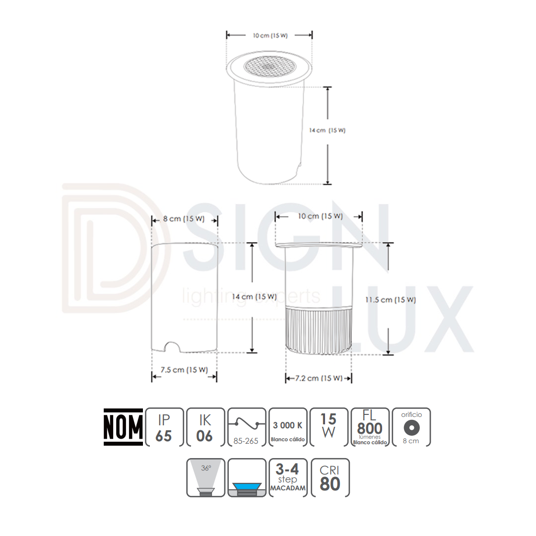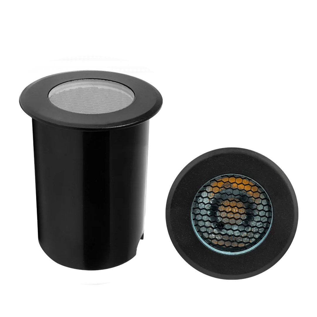 Luminario de piso, led, de exterior, blanco cálido, óptica 36° filtro tipo panal, redondo, de empotrar, aluminio acabado negro incluye housing, 85-265V ca, protección IP65. ILUEP5WHONWW – ILUEP10WHONWW – ILUEP15WHONWW – ILUMILEDS