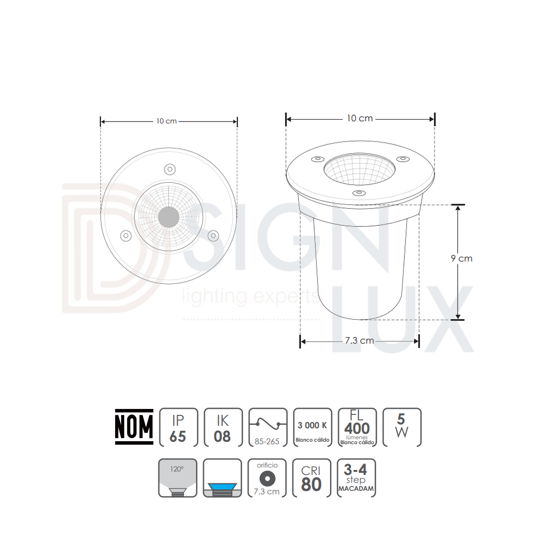 Luminario de piso, led, de exterior, blanco cálido, 5 Watts, óptica 120°, redondo, de empotrar, tapa de acero inoxidable cuerpo aluminio incluye housing, 85-265V ca, protección IP65. ILUEMPT5WWW – ILUMILEDS