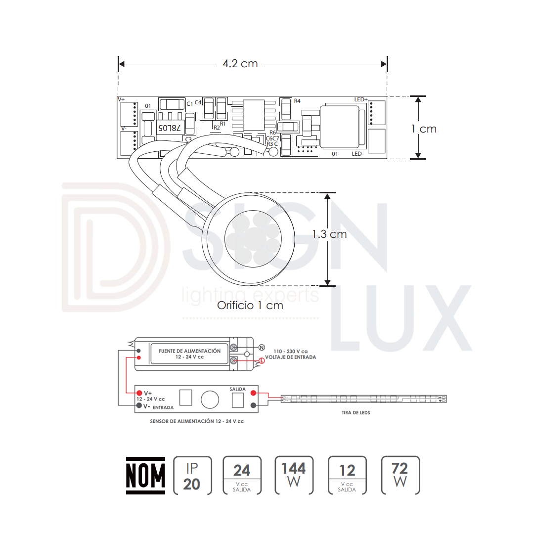 Sensor PIR ON-OFF para tira extraplana led, 72 Watts-144 Watts, PCB incluye sensor con cable, 12-24V cc, protección IP20.