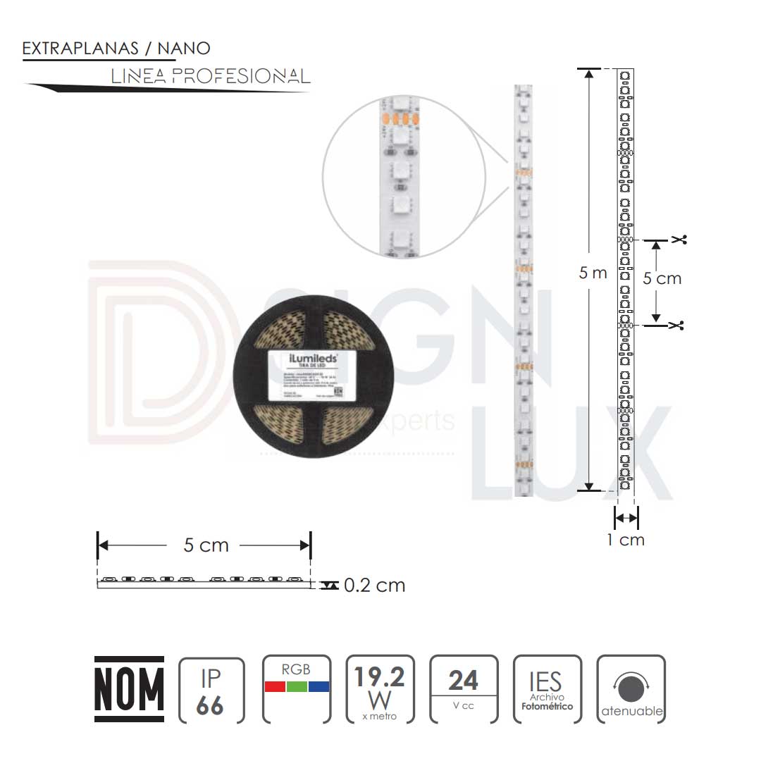 Tira led extraplana RGB de 5m x 1cm con 120 leds por metro, cubierta barniz nano al alto vacío con autoadhesivo 3M, 24V cc, 19.2 W por metro, IP66 para exteriores.