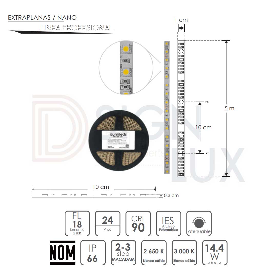 Tira LED extraplana de 5m x 1cm con 60 leds por m, cubierta barniz nano al alto vacío con auto adhesivo 3M, 24V cc, 14.4 W por metro, atenuable IP66 para exteriores