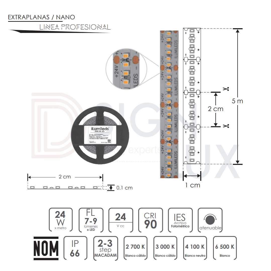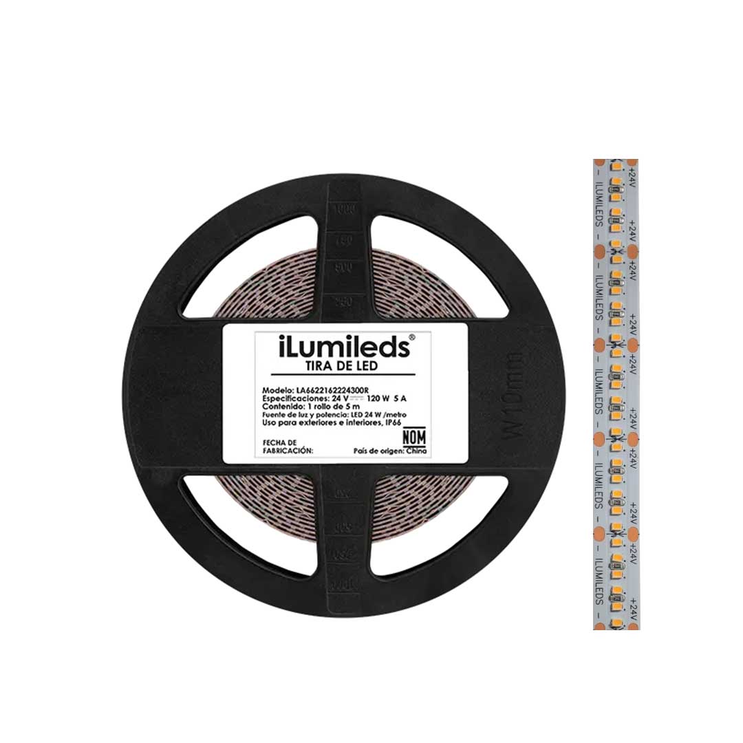 Tira LED extraplana, tipo 2216, rollo de 5m, 300 leds por metro, blanco cálido 2700K, 3000k, blanco neutro 4100K y blanco 6500K. 24 Watts por m, óptica 120° pista de cobre acabado blanco, cubierta barniz nano al alto vacío con auto adhesivo 3M, CRI 90, PCB 2 oz doble cara 24V cc protección IP66. LA6622162224300R / LA6622162724300R / LA662216WW24300R / LA662216Z24300R / LA662216W24300R – Ilumileds