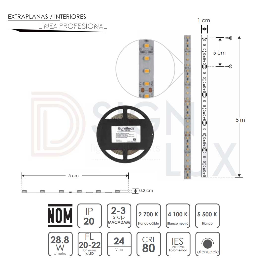 Tira LED extraplana de 5m x 1cm con 120 leds por metro con auto adhesivo 3m, 24V CC, 28.8W por metro, atenuable, IP20.