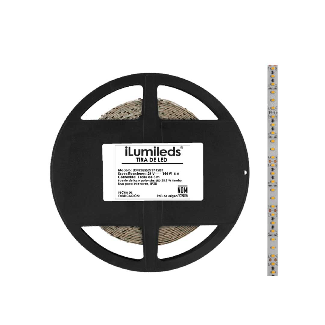 Tira LED extraplana, 2835, rollo de 5m, 120 leds por metro, 2700K (luz cálida), 4100K (luz neutra), 5500K (luz blanca) 28.8 Watts por metro, óptica 120° pista de cobre acabado blanco con auto adhesivo 3M CRI 80, PCB 2 oz doble cara, 24V cc, atenuable, protección IP20. LDPB28352724120R / LDPB2835Z24120R / LDPB2835W24120R – ilumileds