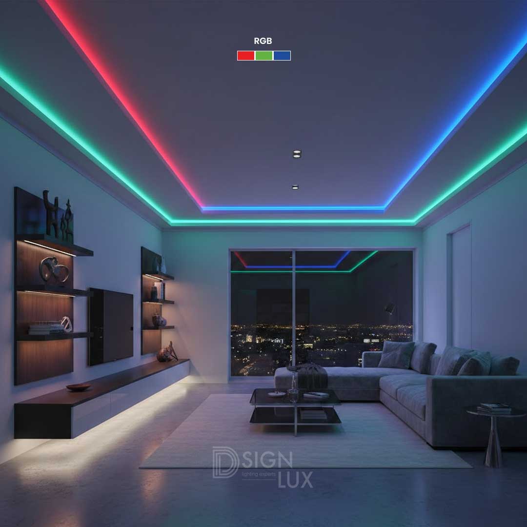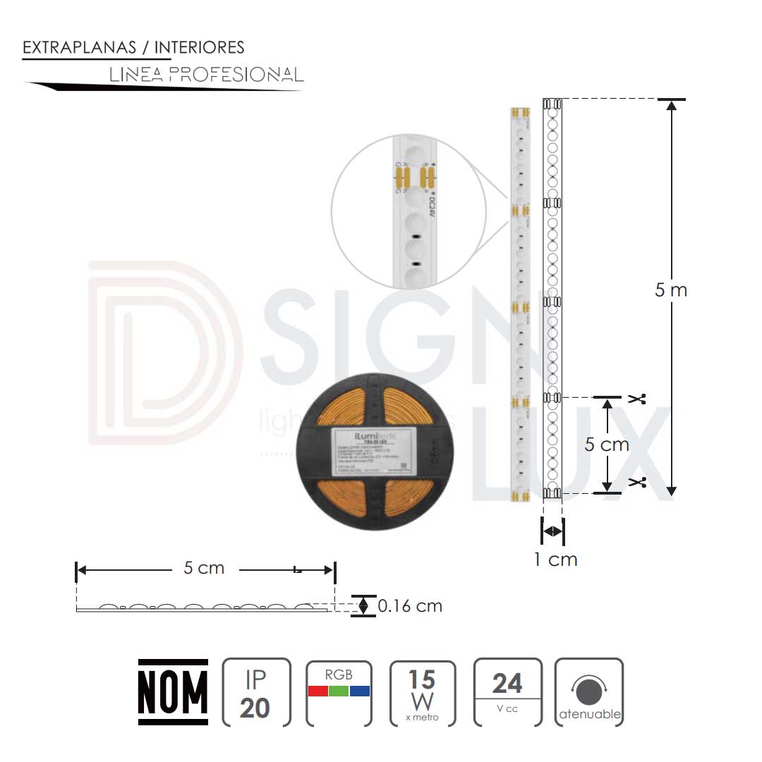 Tira led extraplana COB RGB de 5m x 1cm con 160 leds por metro con auto adhesivo 3m, 24V CC, 15W por metro, atenuable, IP20.
