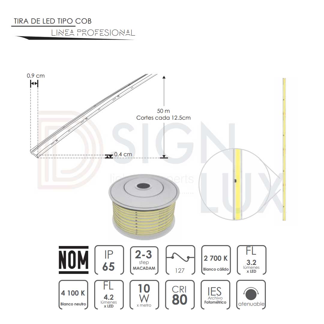 Tira LED extraplana COB de 50m x 0.9cm con 296 leds por metro, encapsulada en TPU con auto adhesivo 3M, tecnología NONWIRE, 10W por metro, 127V ca, IP65 para exteriores.