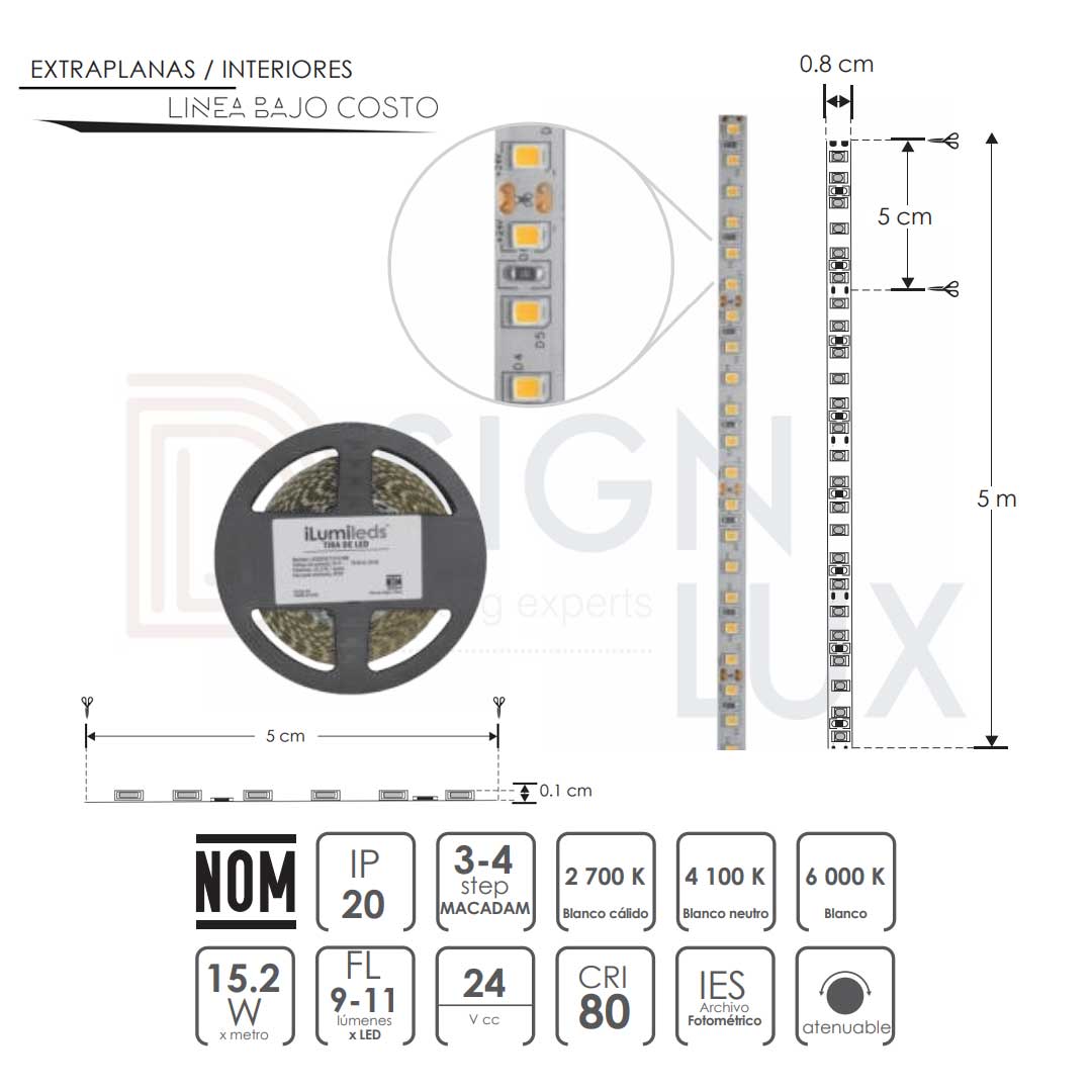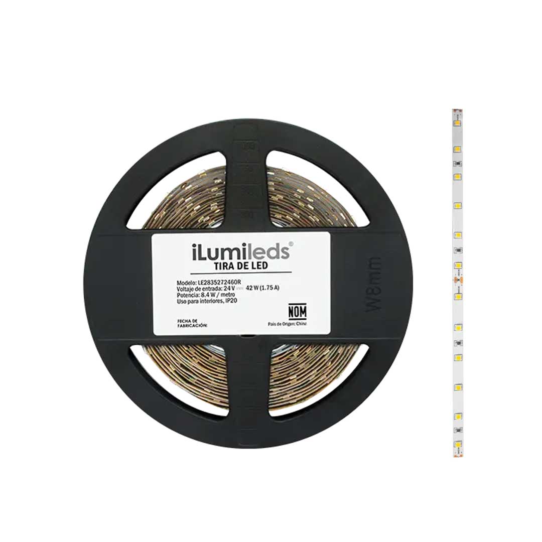 Tira LED extraplana, tipo 2835, 60 leds por metro, 2700 K (Blanco cálido) 4100K (Blanco neutro), 8.4 Watts por m, óptica 120°, pista de cobre acabado blanco con autoadhesivo 3M CRI80 PCB 2 oz doble cara, 24V cc, atenuable, protección IP20. LE2835272460R / LE2835Z2460R – ilumileds