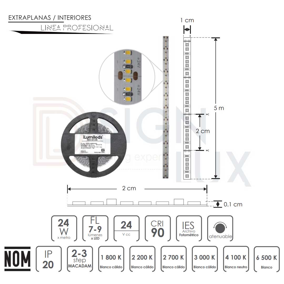 Tira extraplana, de led 2216 5 m con 300 leds por m, 24 Watts por m, óptica 120°, pista de cobre acabado blanco con auto adhesivo 3M CRI 90 PCB 2 oz doble cara, 24V cc, protección IP20. LDPB22161824300R / LDPB22162224300R / LDPB22162724300R / LDPB2216WW24300R / LDPB2216Z24300R / LDPB2216W24300R – Ilumileds
