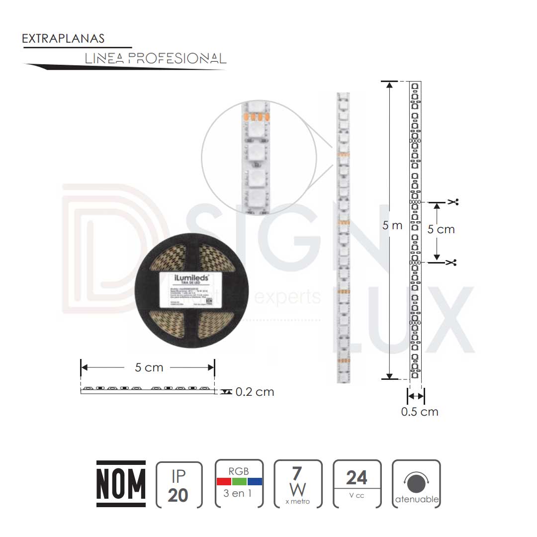 Tira LED extraplana RGB de 5m x 0.5cm con 120 leds por metro con autoadhesivo 3m, 24V CC, 7W por metro, atenuable, IP20.